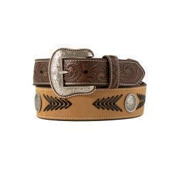 Quality mens Nocona belt by M&F Western Products. It has a roughout body with embossed scrolling tabs. Chocolate chevron lacing and conchos down the body. Finished off with an antique silver finish buckle that has an engraved floral design and rope edge.
